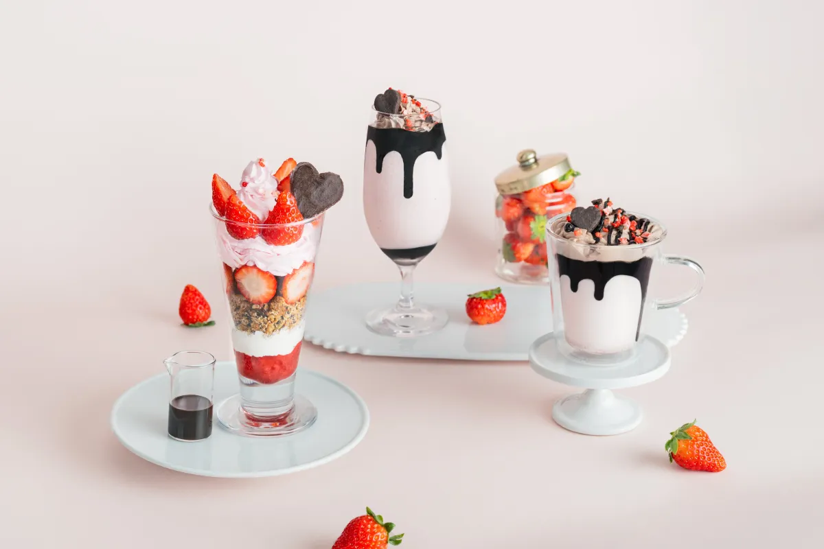 『goma to』が新たに提供するバレンタインメニューは、贅沢なスイーツとドリンクのラインナップで、すべてにごまの風味が生かされています。特に目を引くのは、黒ねりごま、苺、チョコレートの3つの素材を贅沢に使用した以下の3品です。