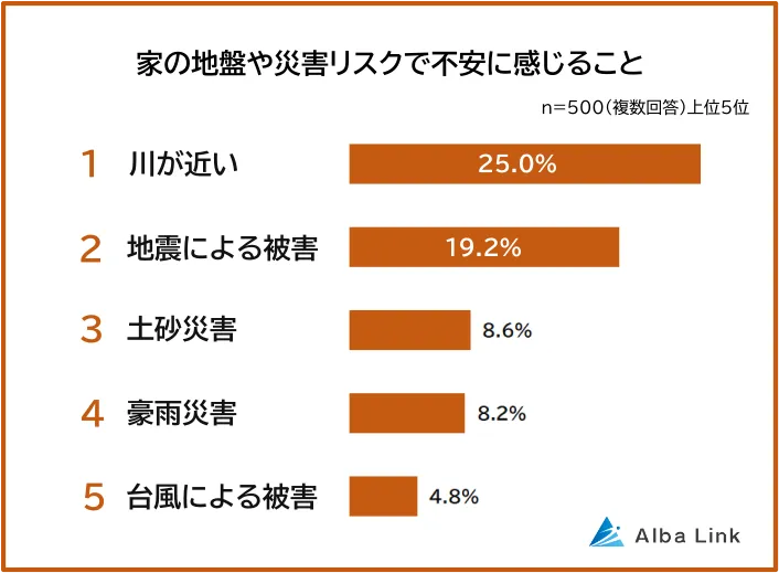 調査において、最も不安を感じる要因は「川が近い」という回答が25%を占め、その後に「地震による被害(19.2%)」や「土砂災害(8.6%)」が続きました。