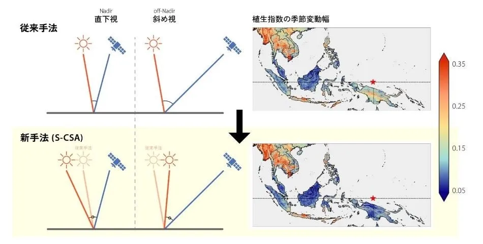この研究チームは、新たに「S-CSA(Spatially-Constant Scattering Angle)」という観測幾何条件を考案しました。これにより、衛星が地表を観測する際のバイアスを大幅に低減できることが分かりました。具体的には、S-CSA条件のもとで算出された植生指数は、地上での光合成によるCO2吸収量との相関が高く、季節ごとの変動をより正確に把握できるようになっています。