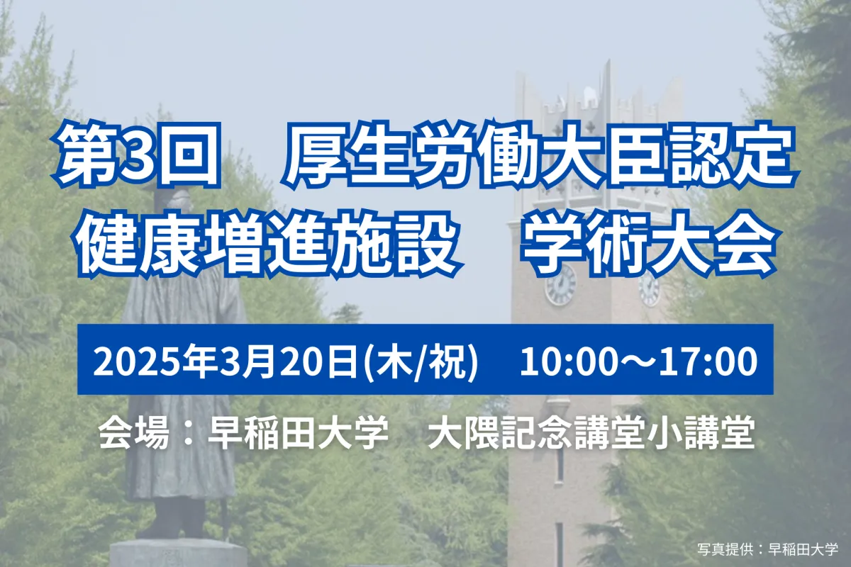 公益財団法人日本健康スポーツ連盟は、3月20日(木・祝)に「第3回厚生労働大臣認定健康増進施設学術大会」を早稲田大学大隈記念講堂小講堂で催します。この大会は、健康増進施設や指定運動療法施設の普及を目指す重要なイベントとなっています。