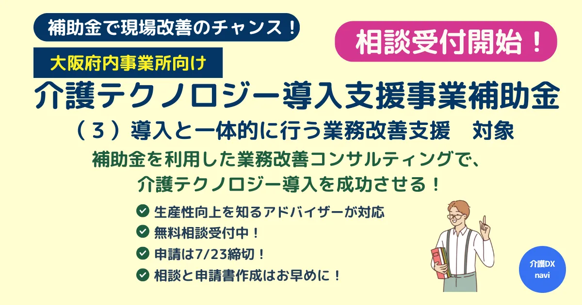 介護業界の生産性向上は、今や多くの施設にとって重要な課題です。その解決策として注目されているのが、介護DXナビが提供する新しい業務改善コンサルティングサービスです。このサービスは、2025年度の「介護テクノロジー導入支援補助金」に対応しており、介護事業者が補助金を最大限に活用できるよう支援します。大阪府内を中心に受付を行っており、今後は他の府県への展開も予定しています。