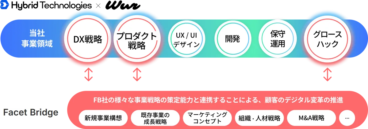 FB社が戦略立案を手がけた顧客に対し、HT社が設計や実装、運用の支援を行います。この一貫した体制により、顧客の事業立ち上げから成長をトータルで支援するパートナーシップを目指します。