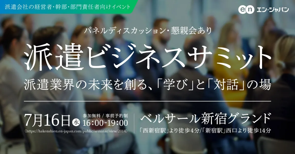 2025年7月16日(水曜日)にエン・ジャパン株式会社が主催する『派遣ビジネスサミット』が、東京都新宿区のベルサール新宿グランドにて開催されることが決定しました。本イベントは、派遣業界に従事する経営者や幹部向けに設けられたもので、昨年も多くの参加者から高い評価を受けました。