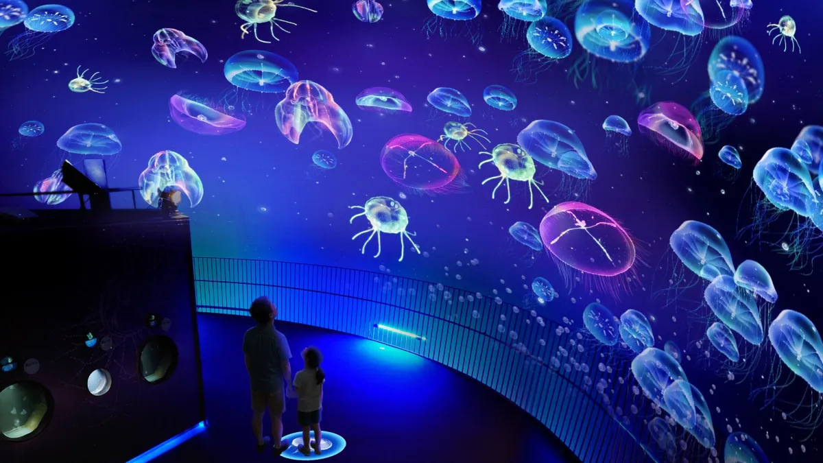 この新たなインスタレーションは、来館者が特に設けられた「九十九島クラゲステップポイント」の上に立つことで、ドーム型スクリーンに映し出されるクラゲの映像が変化する、まさに体験型のコンテンツです。例えば、4つのステップポイントにそれぞれ立つことで、異なる4種類のクラゲが呼び出され、その瞬間ごとに美しい「ハーモニー」が楽しめます。1人でも、複数人での体験でも可能で、立つ位置の組み合わせによって演出が変わるため、毎回新鮮な体験が待っています。まるで足元からクラゲが舞い上がってくるかのような幻想的な光景に、多くの来館者が感動することでしょう。