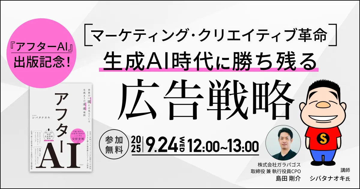 2025年9月24日(水)に、株式会社ガラパゴスが主催するオンラインセミナー「マーケティング・クリエイティブ革命」が開催されます。これは、著名なシリコンバレーの投資家であり、注目のアフターAIに関する著書を手掛けたシバタナオキ氏を招いた特別な機会です。このセミナーでは、生成AI時代の広告戦略についての深い洞察が提供されます。
