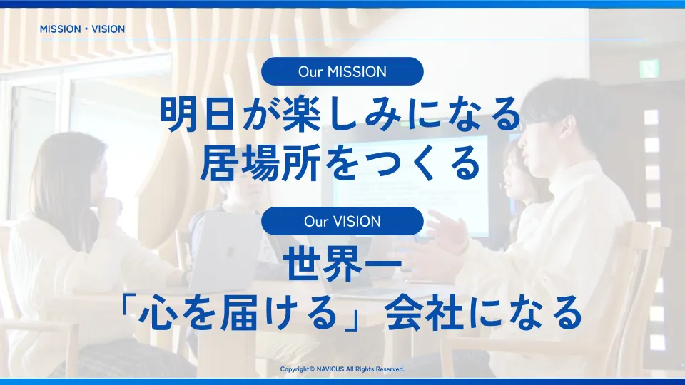 改定されたMISSIONは「明日が楽しみになる居場所をつくる」ことです。これまでVISIONであったこの理念をMISSIONとして掲げた背景には、家庭、SNS、地域社会といったさまざまな繋がりが、個々人にとっての居場所を形成するという思想があります。NAVICUSは、人とのつながりや居場所の意義を深く理解し、すべての人にとって「明日が楽しみになる」ような心地よいコミュニティの創造を目指します。
