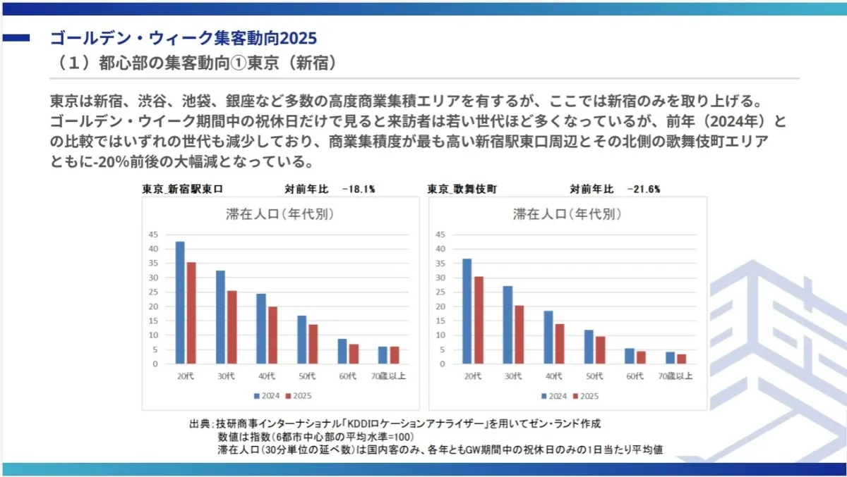 - - 東京(新宿): 新宿エリアは昨年に比べて来訪者数が減少。特に夕方以降の滞在人口が少なくなっています。
