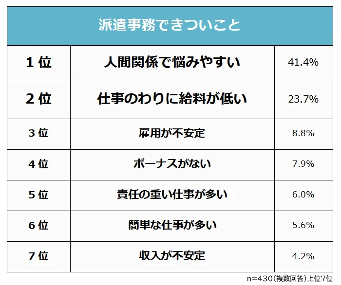 次に、派遣事務における「きついこと」について、調査結果では「人間関係で悩むこと(41.4%)」が最も多く挙げられました。実際、正社員とのコミュニケーションに壁を感じる派遣社員も多く、上下関係によるストレスが報告されています。