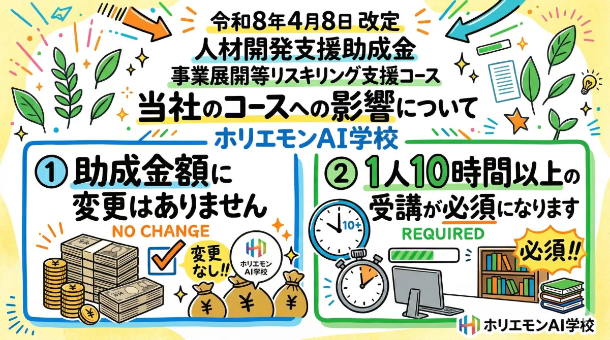 ホリエモンAI学校株式会社(東京都新宿区、代表者:荒木賢二郎)は、令和8年4月8日に改定された「人材開発支援助成金(事業展開等リスキリング支援コース)」に関する情報を公開しました。この改定が、当社の受講企業やこれから導入を検討している企業にとってどのような影響を与えるのかを詳しく解説します。