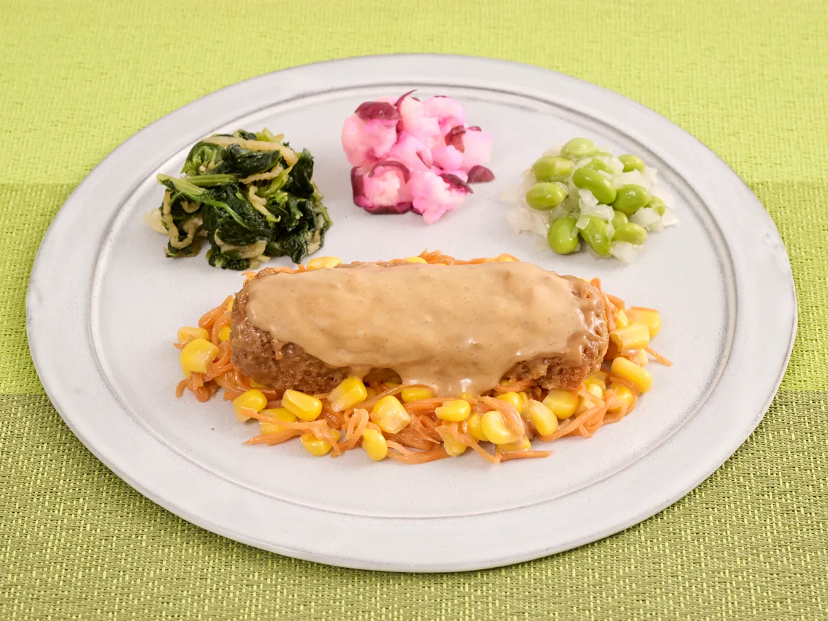 本メニューは主菜のマグロカツだけでなく、副菜にもこだわっています。クセになる甘辛だれのほうれん草、彩り豊かなカリフラワーのしば漬け和え、さらにはさっぱりとした枝豆とキャベツの和え物が添えられており、食体験をより豊かにしています。これにより、味わいや彩り、食感といったバランスが取れた一皿となっています。