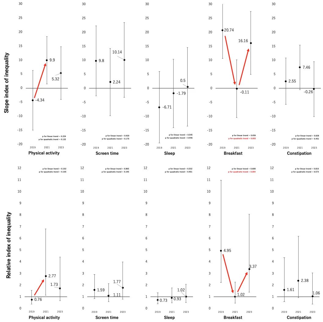 調査結果から、2019年には健康行動の顕著な格差は見られなかったものの、2021年に入ると、特に低所得層において身体活動の不足が目立つようになり、この傾向は2023年まで持続しました。また、朝食摂取に関しては、流行中に一時的に格差が解消されましたが、その後再燃するという意外な結果が示されました。スクリーンタイムについては、低所得層での長時間化が進み、経済的格差が拡大したことが確認されました。睡眠や排便の習慣には、あまり顕著な格差は観察されませんでした。