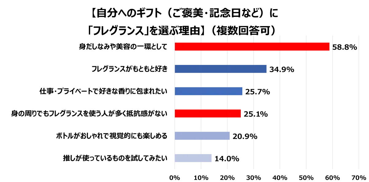 調査結果によれば、自分自身のご褒美や記念日としてフレグランスを贈りたいと考える人もおり、25.6%が「自分へのギフトにフレグランスを選ぶことを検討したい」と回答。この背景には、身だしなみや美容への意識が高まっていることがあると考えられます。また、好きなアイドルや有名人が使っているフレグランスを試してみたいという意見も見受けられ、現在の推し活ブームが影響している様子です。