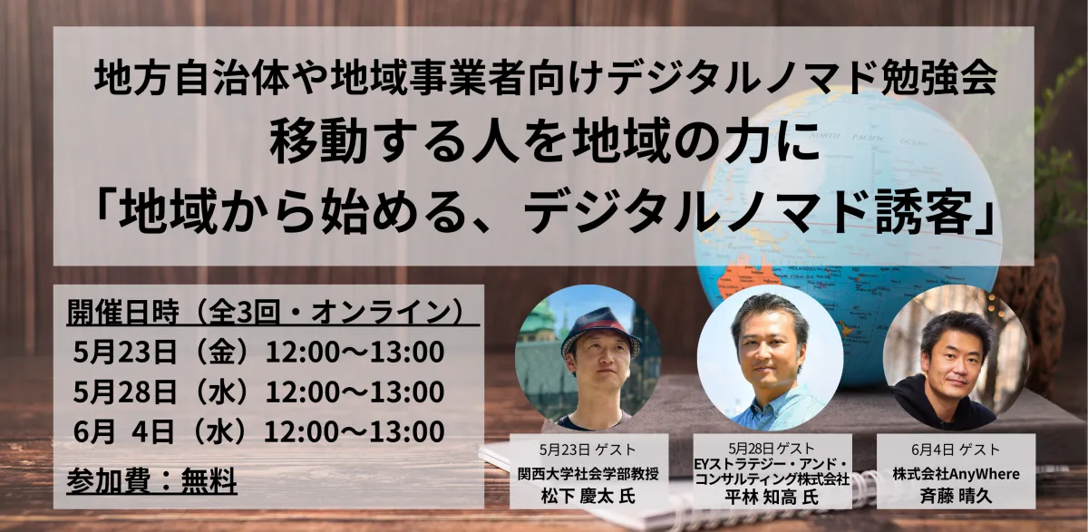 そうした背景を踏まえ、株式会社AnyWhereが主催する全3回のオンライン勉強会「移動する人を地域の力に - 地域から始める、デジタルノマド誘客 - 」が開催されます。本勉強会では、地域の自治体や事業者がデジタルノマドを誘致し、持続可能な仕組みを導入する方法を学ぶ関係者向けの内容です。