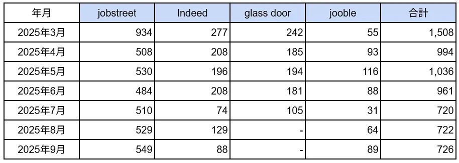 調査は、2025年9月1日から30日までの間に行われ、主要な求人サイトを対象に求人数をカウントしました。結果、jobstreetで549件、Indeedで88件、joobleで89件の求人が確認され、合計で726件という結果となりました。