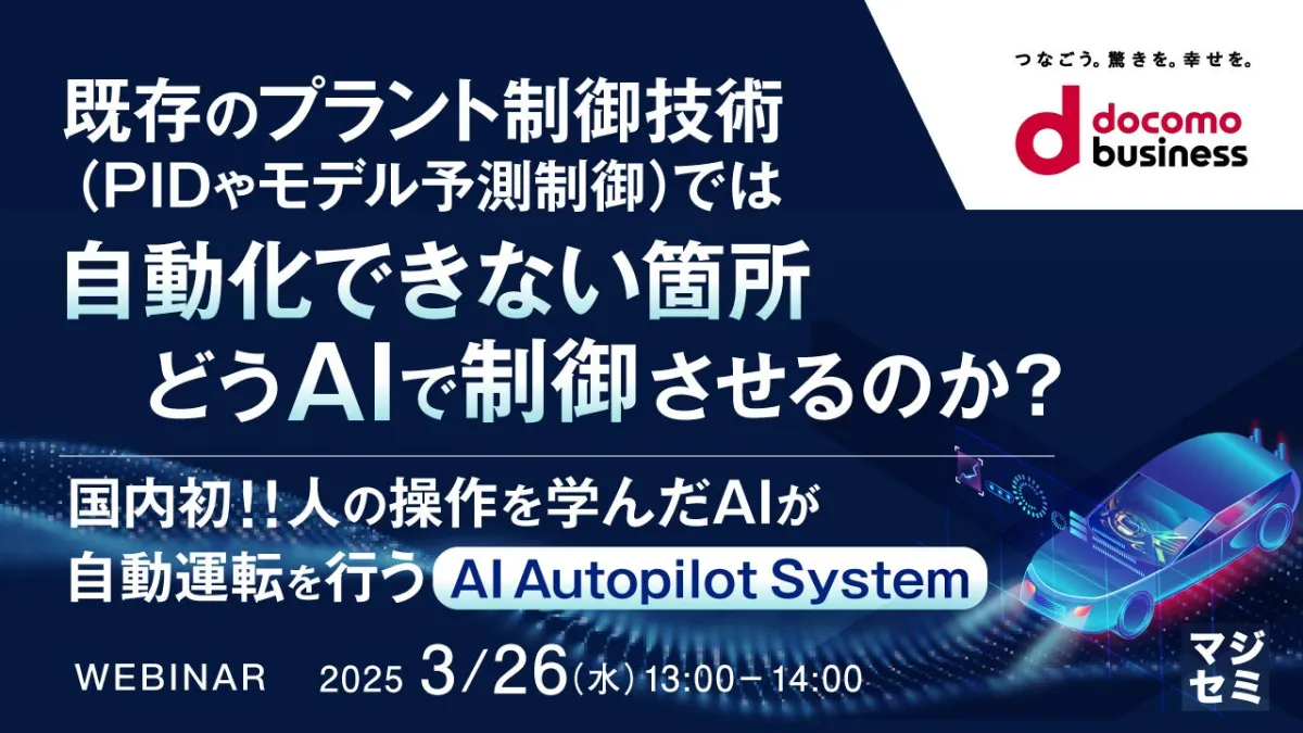 このウェビナーは、手動操作の自動化やコスト削減を目指す化学、石油精製、食品加工の業界関係者に最適です。最新のAI技術を活用したプラント制御のノウハウを学ぶ貴重な機会として、多くの方々にご参加いただきたいと思います。