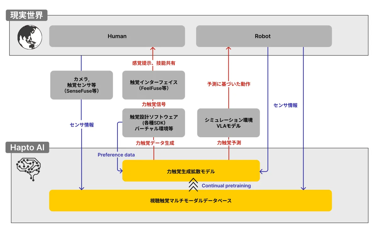 この構想の中核をなすのは、これまでに開発されたセンサデバイス「SenseFuse™」と触覚フィードバックを提供する「FeelFuse™」です。これらのデバイスは、人間が触覚データを意識的に感じ取るだけでなく、ロボットがそのデータを用いてより洗練されたインタラクションを形成することを可能にします。これにより、人間とロボットの相互作用がさらに進化します。
