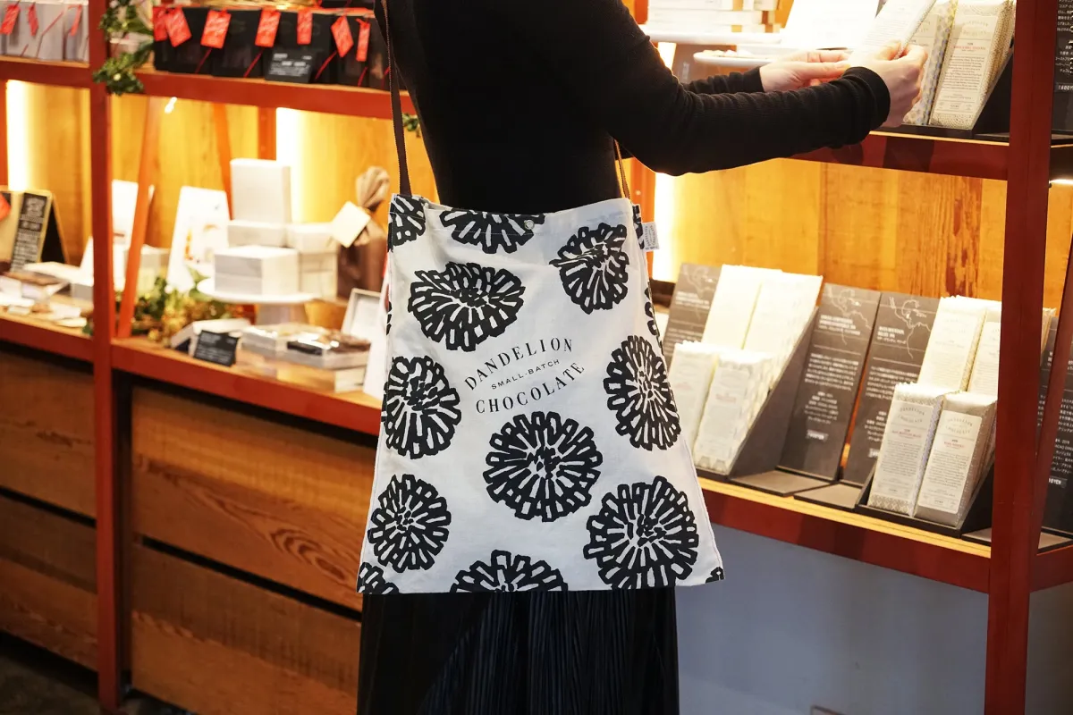 このトートバッグは、SOU・SOUのテキスタイルデザイナー脇阪克二氏が「たんぽぽ」をテーマにデザインしました。ダンデライオン・チョコレートのブランド名の由来でもあり、ポップで温かさを感じる模様が特徴です。