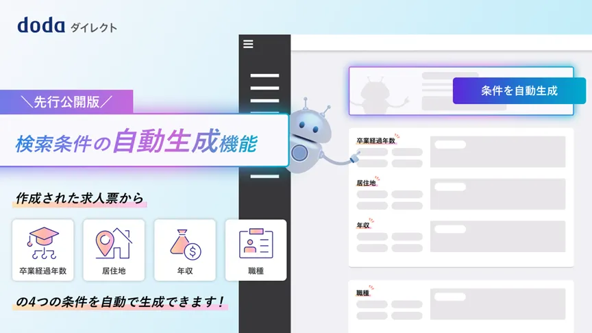 現代の採用活動において、優秀な人材を選び取ることは非常に重要です。しかし、スカウトメールを送付するためには、企業側が対象者を選定するための条件を設定しなければなりません。特に、初めてスカウトサービスを利用する企業や、複数の求人を同時に扱う企業にとって、この条件設定は時間のかかる作業となっています。この問題を解決するために、「doda ダイレクト」は、自動生成機能を開発しました。