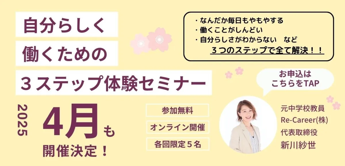 現在、著者主催のさまざまなセミナーやイベントが企画されています。その一つが「自分らしく働くための3ステップ無料セミナー」です。複数の日程が設けられ、各日5名限定で参加できるこのセミナーは、理想の働き方を見つけるための第一歩を提供します。