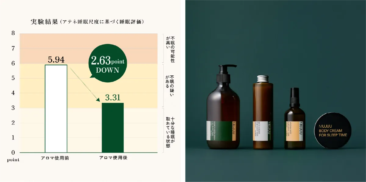 多忙な現代社会において、多くの人々が睡眠不足に悩んでいます。MUJUUでは、睡眠不足の原因となる「疲れた脳」を癒すために、香りに注目。このブランドは、日本睡眠改善協議会と共に研究を重ね、自信に満ちたオリジナルの香りを開発。特に20代から30代の男女に効果をもたらすことが実証されています。