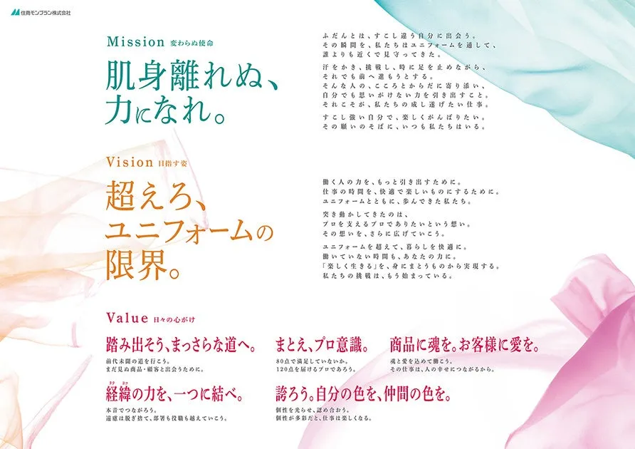 次に、ビジョンでは「超えろ、ユニフォームの限界。」というメッセージが提示されています。これは、ユニフォームの用途や価値を広げることを目指し、働く人をさらにサポートする企業へと進化する意志を表しています。住商モンブランは、ただユニフォームを提供するのではなく、身にまとうものから日常生活を快適にする企業を目指して挑戦を続けていきます。