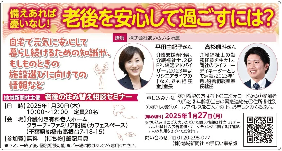 2025年1月30日(木)、千葉県船橋市の介護付き有料老人ホーム「クラーチ・ファミリア船橋」にて、「老後の住み替え相談セミナー」が開催されます。このセミナーは、地域新聞社が主催し、シニアライフのトータルサポートを提供する株式会社あいらいふが講師として参加します。