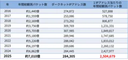 2025年は、約7010億パケットのサイバー攻撃関連通信が観測され、2024年から2.2%の増加を見せました。これは、サイバー攻撃の潜在的危険性が高まっていることを示唆しています。また、1つのIPアドレスあたり年間のパケット数も増加傾向にあり、インターネット上での攻撃準備行動が常態化していることが裏付けられています。