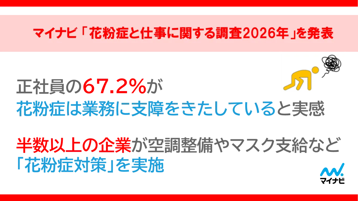 株式会社マイナビは、「花粉症と仕事に関する調査2026年」の結果を公表しました。この調査は、花粉症が転職活動や仕事に与える影響を分析することを目的として、全国の企業や個人を対象に行われました。今回の調査結果は、前回の調査と合わせて、花粉症の影響をより詳細に理解するための重要なデータとなりました。