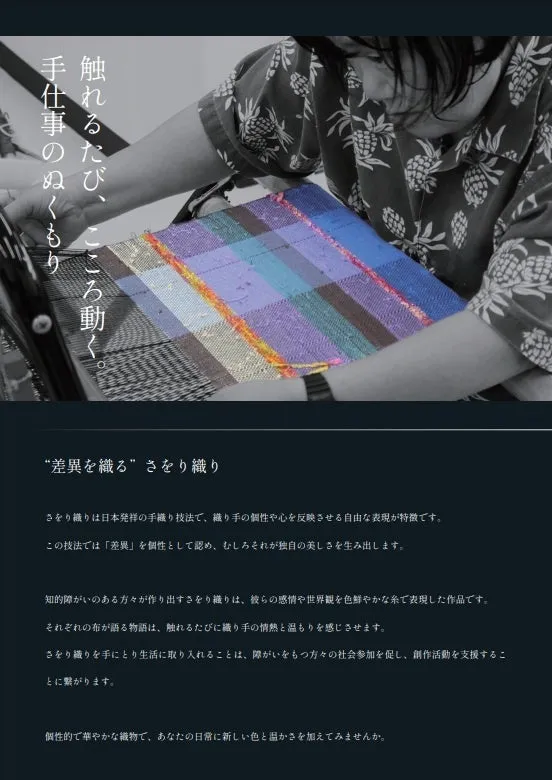 さをり織りを扱うことは、単なる商品購入の枠を超えて、障がいを持つ方々の創造的な活動を支援する行動と言えます。征峯会は、さをり織りを通じて、彼らの表現力や才能を社会へ発信し、多様性の大切さを広めています。私たちは、すべての人が持つ独自の個性を尊重し、同じではない美しさを広めたいと願っています。さをり織りを介して、多くの人々が新たな価値に気付き、多様性を認め合う社会が実現することに貢献したいと考えています。