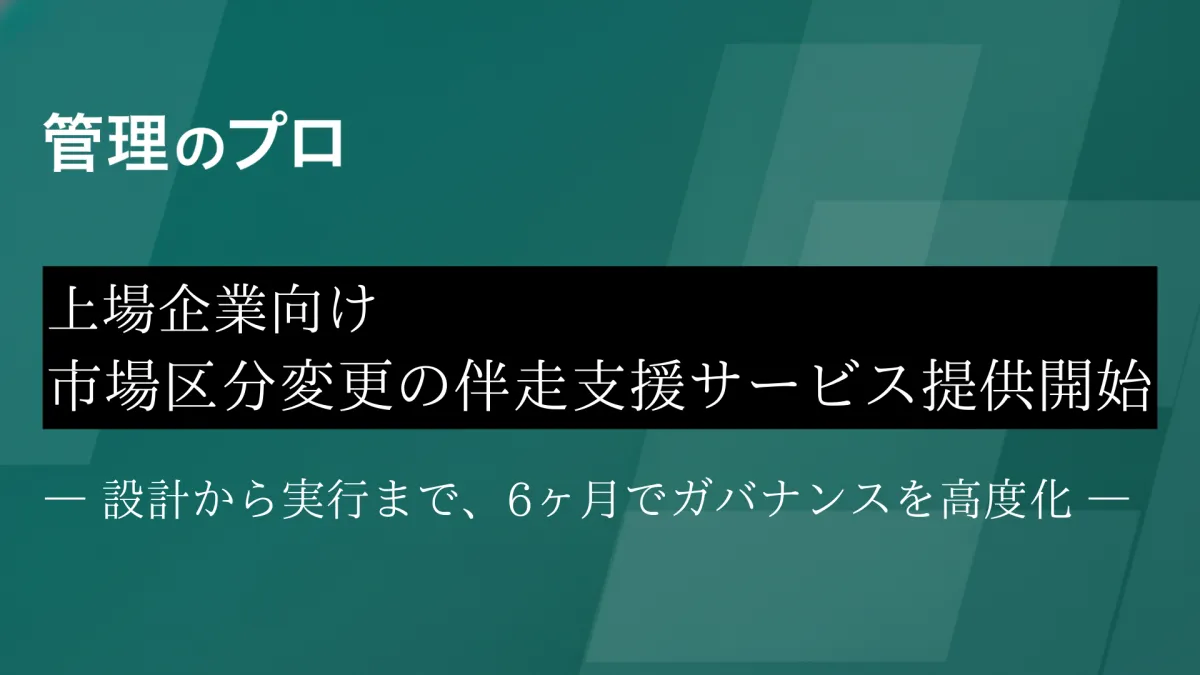 株式会社管理のプロが、上場企業を対象に「市場区分変更 伴走支援サービス」の提供を始めました。このサービスは、特に2022年の市場再編以降、加速する上場企業の市場区分変更に対応するものです。主にグロース市場からスタンダード市場、さらにはスタンダード市場からプライム市場への移行を、企業価値向上に寄与する形で進めることを目的としています。