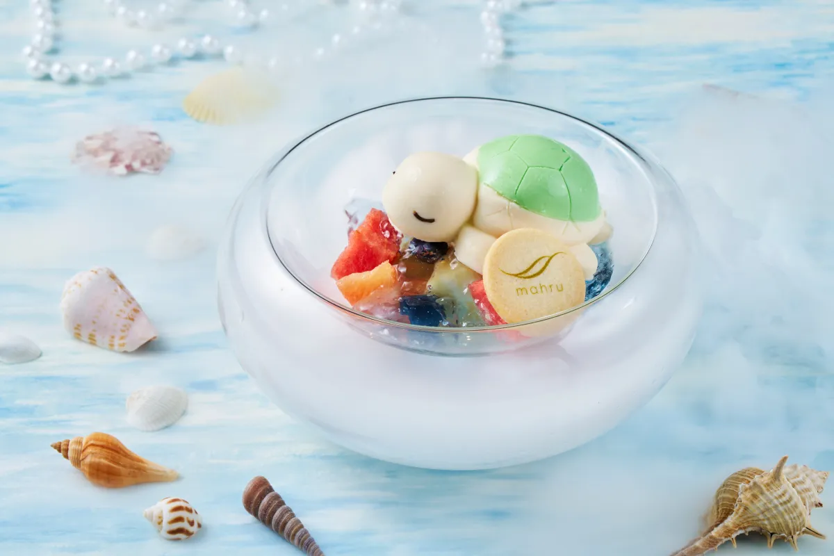 具体的には、滑らかなバニラアイスクリームが活用されており、香り豊かなバニラの風味が口いっぱいに広がります。また、エメラルドグリーンのゼリーは、海面のキラメキを思わせる輝きで、自然の甘さが楽しめます。さらに、旬のフルーツは色とりどりの魚のように彩り豊かで、見た目でも楽しませてくれます。