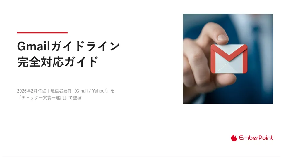 エンバーポイント株式会社は、2026年2月時点の最新情報を反映したホワイトペーパー『Gmailガイドライン 完全対応ガイド』をリリースしました。この資料では、Gmailが求める送信者要件を中心に、多くの企業が抱える課題や、継続的な配信品質を維持するための「6つのステップ」を詳述しています。