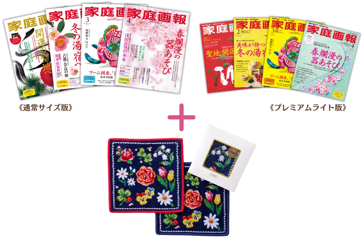 2025年4月1日から4月25日までの期間限定で実施されるこのキャンペーンでは、『家庭画報』の年間購読に加え、フェイラーのハンカチが数量限定で付いてきます。このハンカチは、シュニール織と呼ばれるドイツの伝統技法を用いて制作されており、柔らかな肌触りと美しいデザインが特徴です。バラ、クローバー、スズラン、デイジーなど、春の花々をモチーフにした8種のデザインから選べるほか、縁の色もレッドとネイビーの2タイプから選べるため、贈る相手の好みに合わせたセレクトが可能です。