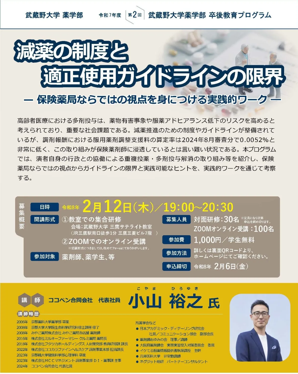 講師には、ココペン合同会社の代表役員である小山裕之氏が予定されています。彼は薬剤師としての経験を活かし、参加者に貴重な知識と実践方法を提供します。小山氏は京都薬科大学を卒業後、様々な医療機関での経験を積み、教育や研修に関する専門的な知識を有しており、幅広い視点からのコメントが期待されます。