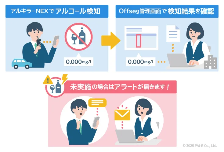 アルキラーNEXとOffsegの連携によって、運転者がアルコールチェックを行わずに運転を開始すると、自動的に管理者と運転者に「未検知アラート」が送信される仕組みが整いました。これにより、管理者は運行中の状況を常時把握することができ、注意喚起を迅速に行えるようになります。これまでは、運転前のチェックが行われていなかった場合のリスクが高まっていましたが、アラート機能の導入でそのリスクが軽減されることが期待されています。