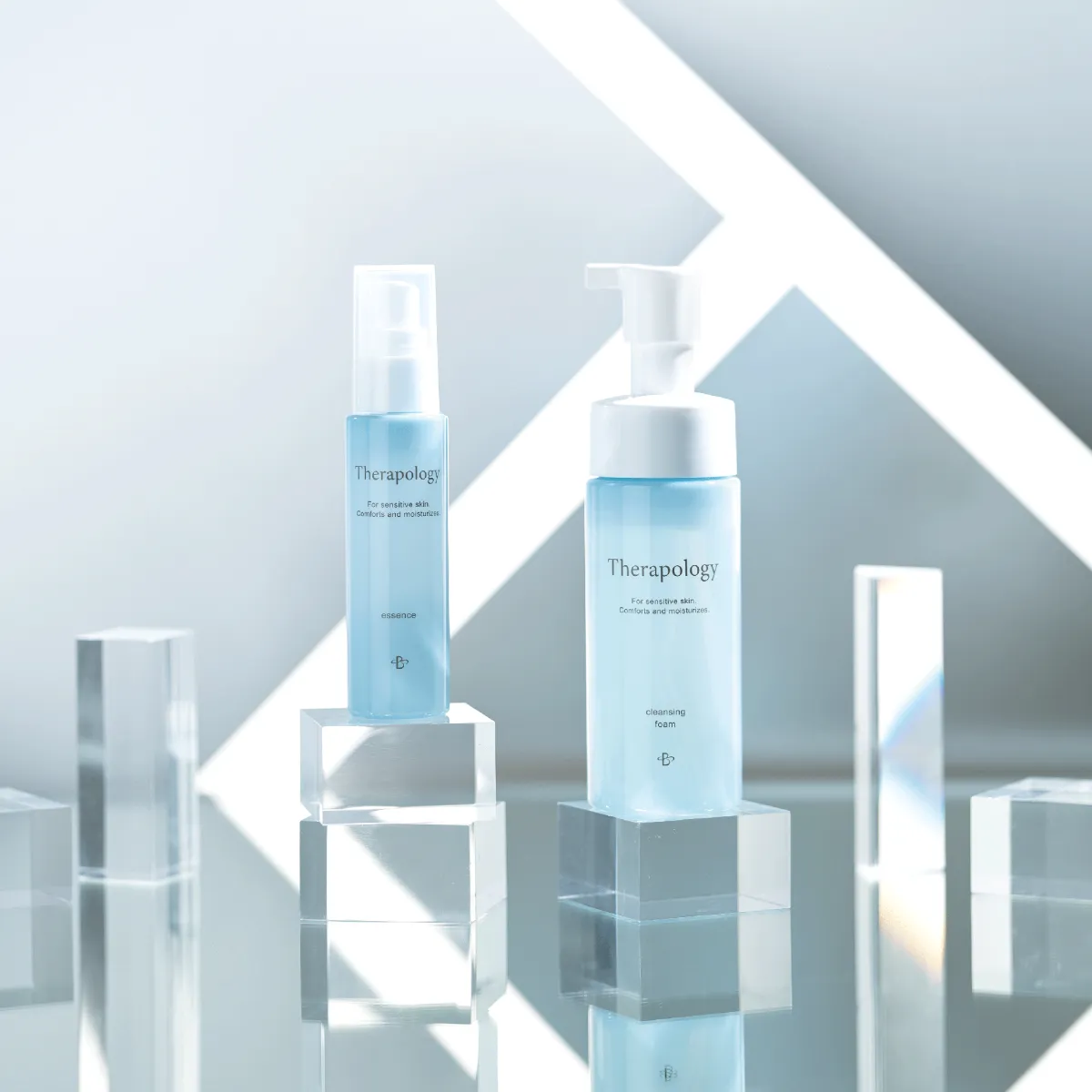 『セラポロジー』は、泡タイプのクレンジング・洗顔と美容液の2ステップで行えます。まずは、敏感肌用クレンジング・洗顔『セラポロジークレンジングフォームAD』150mL(5,500円税込)で優しく洗浄し、その後は『セラポロジーエッセンスAD』55g(8,800円税込)を使い、濃厚な潤いを肌に届けます。この2つの製品で、手軽に美肌を実現することができます。