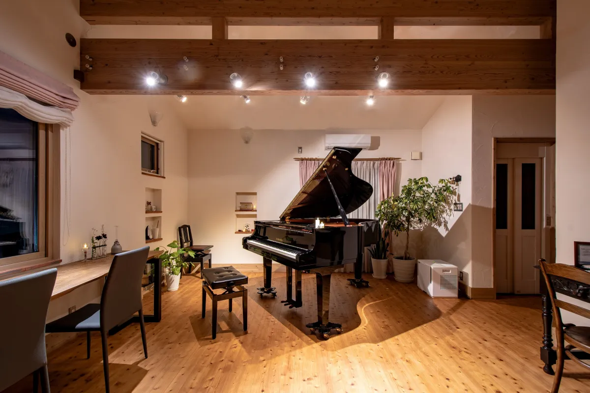 「小規模でも、ちゃんと良い音や環境を提供したい」ということで設計されたこのスタジオでは、YAMAHA製のグランドピアノが優れた響きを持つように設計されています。木のぬくもりと吹き抜けによる自然な響きが特徴で、少人数から大規模なイベントまで対応可能です。