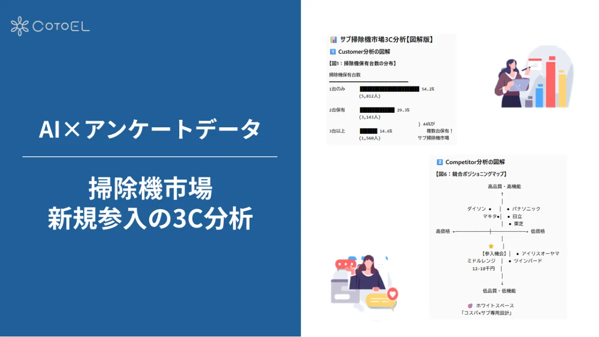 掃除機市場は現在、共働き家庭の増加やさまざまな掃除ニーズに応じた製品の選択肢が多岐にわたる時代を迎えています。このような変化に合わせて、マイボイスコム株式会社は最新のAI分析ツール「CotoEL」を活用し、新たに掃除機市場に参入する企業向けの3C分析を行いました。ここでは、その分析結果を基にした新規参入に関する見解をお伝えします。