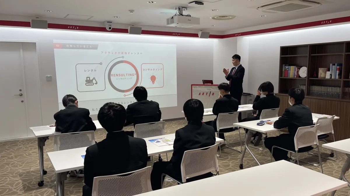 2026年2月3日、アクティオの本社で7名の生徒が参加し、まずは建設機械レンタル業界が持つ役割や、アクティオが展開する事業の紹介から始まりました。同社は「レンタル」と「コンサルティング」を組み合わせた斬新なビジネスモデルで、業界の課題解決に取り組んでいます。