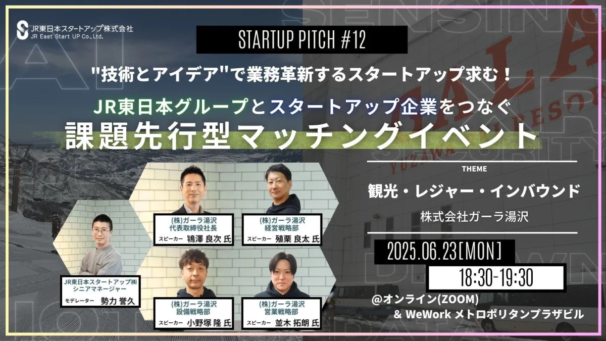 「STARTUP PITCH#12」は、2025年6月23日(月)に行われ、参加費は無料です。テーマは『観光・レジャー・インバウンド』で、特にスキー場や観光施設のオペレーションに関する課題に焦点を当てます。GALA湯沢スノーリゾートの関係者が登壇し、施設運営における具体的な課題や必要とされる技術を発信します。