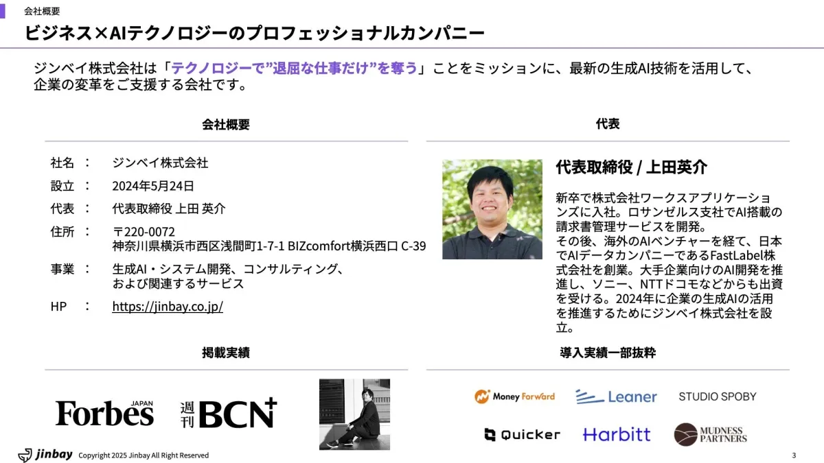 ジンベイ株式会社は「テクノロジーで”退屈な仕事だけ”を奪う」というミッションのもと、生成AIを活用して業務のデジタル化を推進しています。この新しい採用支援サービスを通じて、企業の生産性向上と成長を支援していきます。