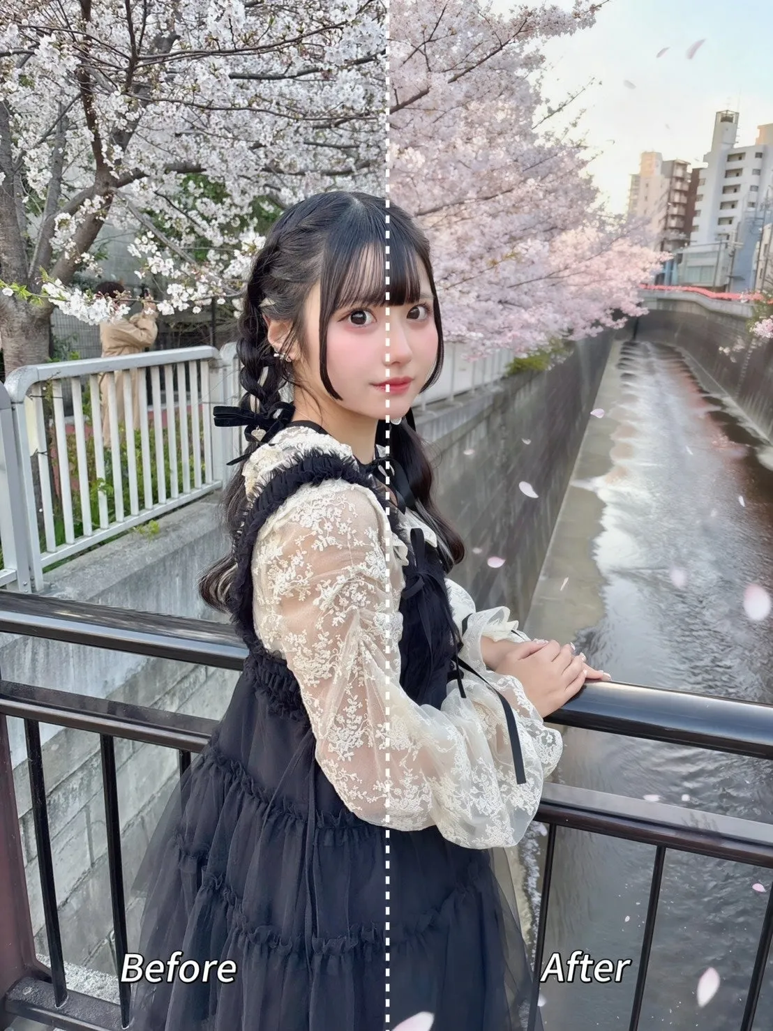 桜の見頃は毎年変動するため、多くの人が「お花見を楽しみにしていたのに思ったより桜が少なかった」と口にします。そんなユーザーの声に耳を傾け、Meituはこの新機能を開発しました。「桜エフェクト」を使うことで、5分咲きや散り始めた桜でも、わずか数タップで画面いっぱいに広がる満開の桜の風景が創り出せます。