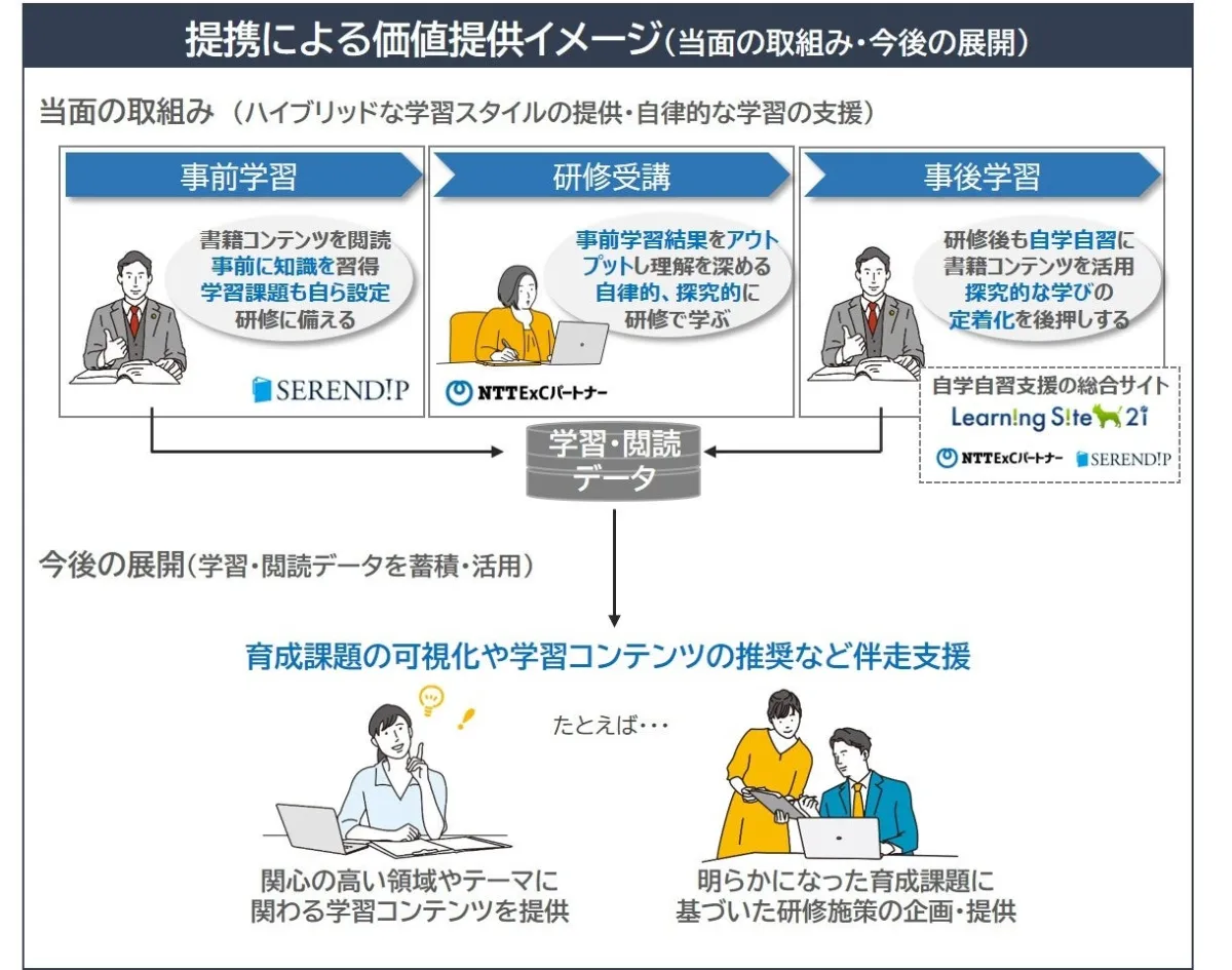 提携の主な目的は、ハイブリッドな学習スタイルの提供だ。従来の教育研修は、インプット重視の均一な教材に基づくものであり、個々の学習スタイルやニーズに対応するのが難しかった。しかし、NTT ExCパートナーが提供する教育研修プログラムにSERENDIPのダイジェストコンテンツを組み込むことで、参加者は自分のペースで学びを進めることができる。反転学習や前後学習といった手法を取り入れ、個別の意欲や達成度に応じた柔軟な学習を実現する。