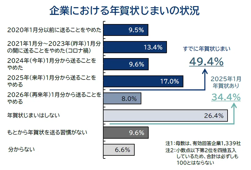 具体的な調査結果では、2024年1月分を最後に年賀状をやめることを決定した企業が6社に1社の割合で見られ、2025年からさらに年賀状を廃止する予定の企業も8%に達しました。一方で、『年賀状じまいはしない』と回答した企業は約26%で、少数派ではありますが、年賀状文化を大切に思う企業も存在しています。中には、親しい取引先との年賀状交換を続けている企業もあり、業界ごとのスタンスが分かれる結果となっています。