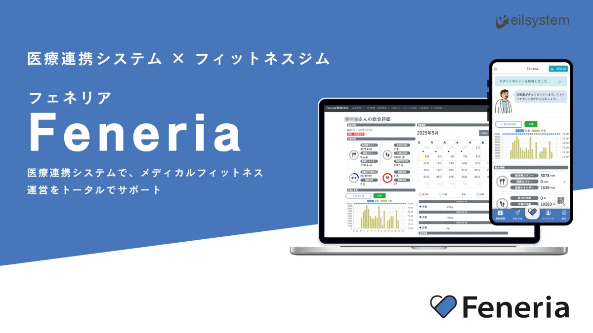 Feneriaは、医療機関と連携しながら運営される健康増進施設向けの会員管理システムです。このシステムは、医療機器や設備、検査キットを連動させ、会員それぞれに最適な運動処方を提供します。導入施設では、会員向けアプリ「Feneria」を通じて、ジム内外の健康データを一元管理することが可能です。収集されたデータに基づき、個々の会員に対する新たな付加価値が提供されます。