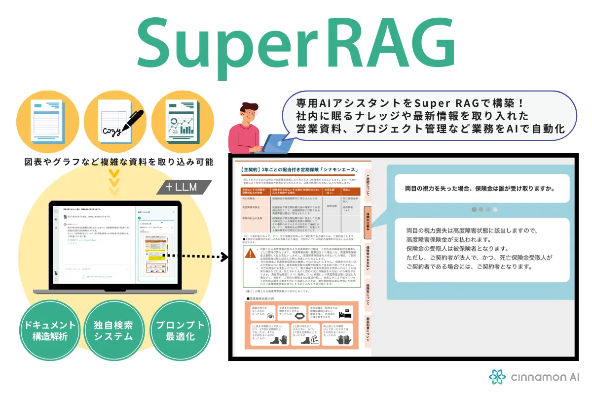 「Super RAG」は、多様な情報を迅速に処理し、ビジネス上の意思決定を支援するための新たなツールです。このプロダクトは、企業が蓄積している多くのデータを最大限に活用し、自社のニーズに合わせたカスタマイズなしで高い精度の回答を提供します。これによって企業は、業務の効率化を図るだけでなく、戦略的な意思決定を行うための強力な力を得ることができます。