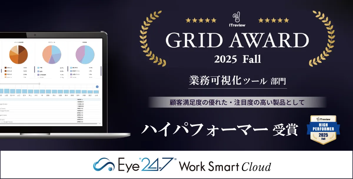 株式会社フーバーブレインが提供するPCログ管理ツール「Eye“247” Work Smart Cloud」が、アイティクラウド株式会社主催の「ITreview Grid Award 2025 Fall」において、業務可視化ツール部門で「High Performer」の称号を受け取りました。この受賞は、ITreviewに掲載された約14.6万件のレビューをもとに行われており、高い顧客満足度を基にした評価です。