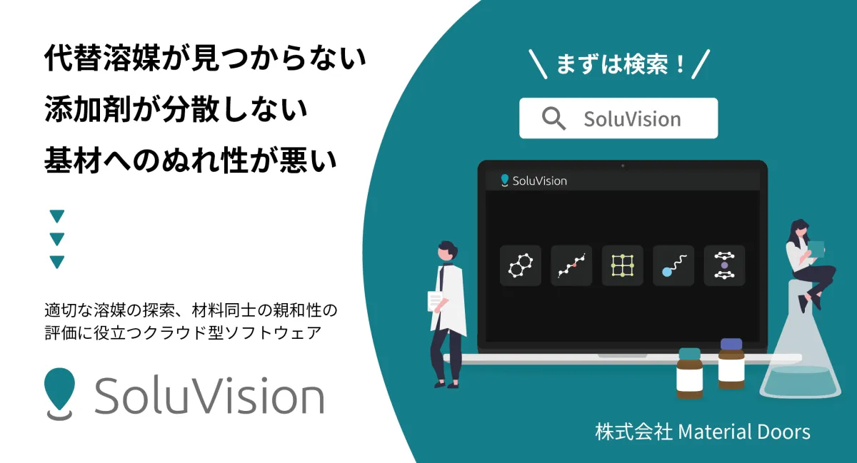 材料開発において、効率的なプロセスやコスト削減は常に求められています。そこで注目を集めているのが、株式会社Material Doorsが提供するクラウド型ソフトウェア「SoluVision」です。このソフトウェアは、物理理論であるハンセン溶解度パラメータ(HSP)に基づき、材料間の親和性を正確に計算・予測することで、開発業務の大幅な効率化を実現します。