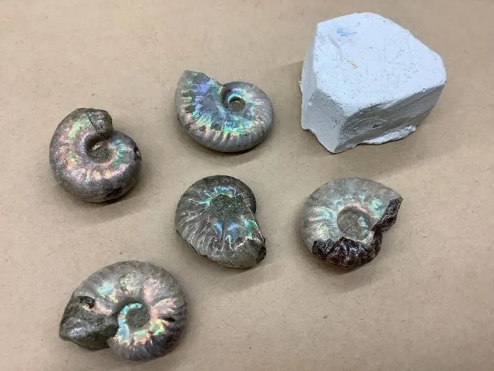 この日のハイライトは、「化石体験教室」。このプログラムでは、石膏でできた石の中から2~3cmの美しい化石、虹色アンモナイトを取り出す「化石取り出し」や、本物の化石の型を使ってレプリカを作る「化石レプリカ作り」が体験できます。