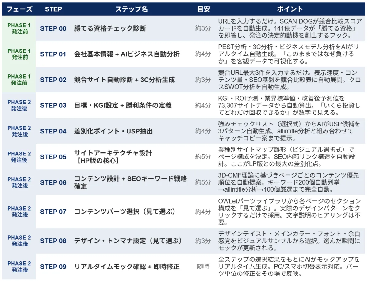 このプラットフォームは全体で10ステップから成るプロセスを経て、最短18分で顧客の意向に合ったサイトが設計されます。これまで40分以上かかっていたヒアリングを短縮し、業務の効率化を図っています。さらに、AIがリアルタイムでデータを解析し、具体的な根拠を提供することで、発注者は自信を持って決断できます。